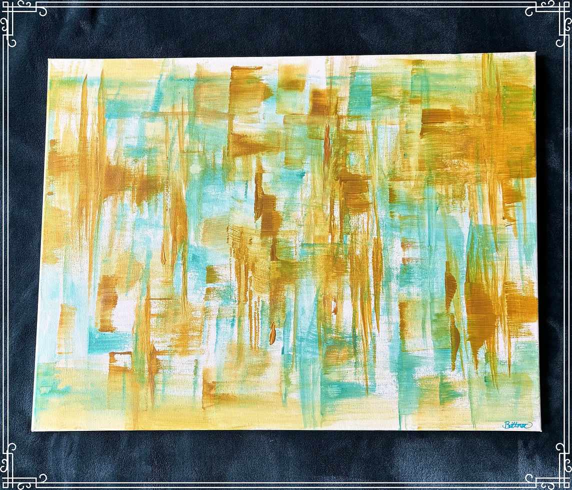 A luminous cascade of liquid gold, soft teal, and warm color sweeps across the canvas in this expressive abstract work. Thick, gestural brushstrokes and delicate drips evoke sunlight on moving water or wind through golden grass at dawn. The serene yet energizing palette suits modern, coastal, or minimalist spaces.
